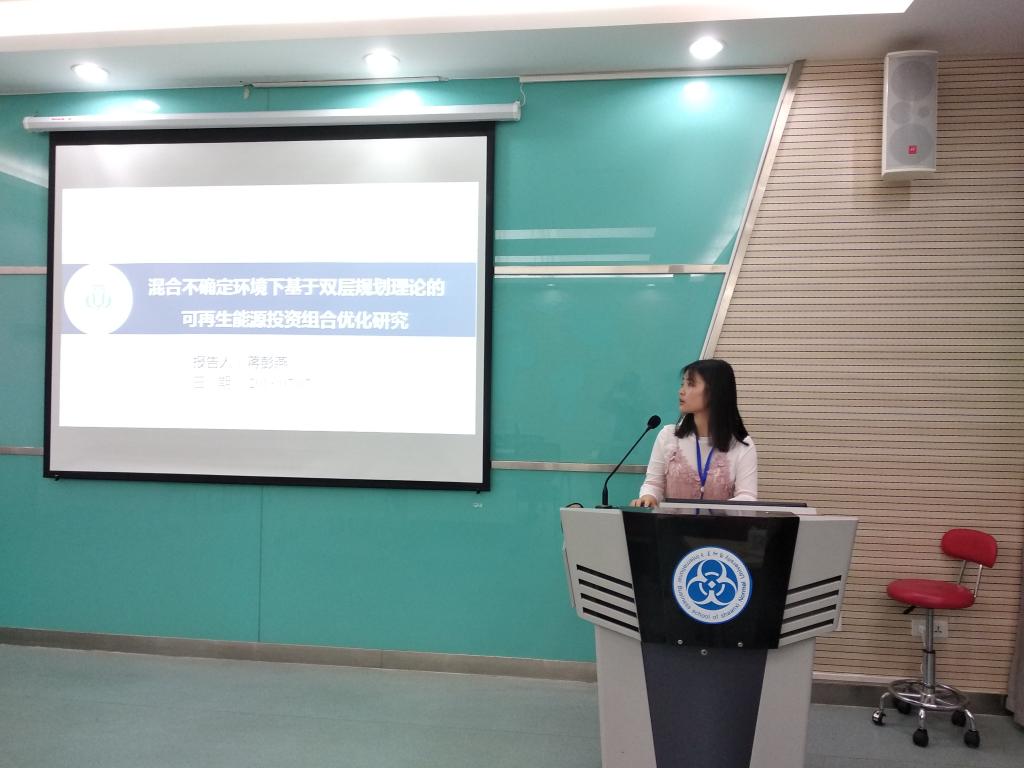 蒋彭燕作为本次会议唯一研究生代表在“风险管理”论坛中,做以《混合不确定环境下基于双层规划理论的可再生能源投资组合优化研究》为题的论文汇报,精彩的发言获得现场专家的一致好评,评论专家认为论文以可再生能源消纳矛盾作为文章切入点非常新颖,肯定了其在能源规划指导与投资优化选择方面具有极高的研究价值。