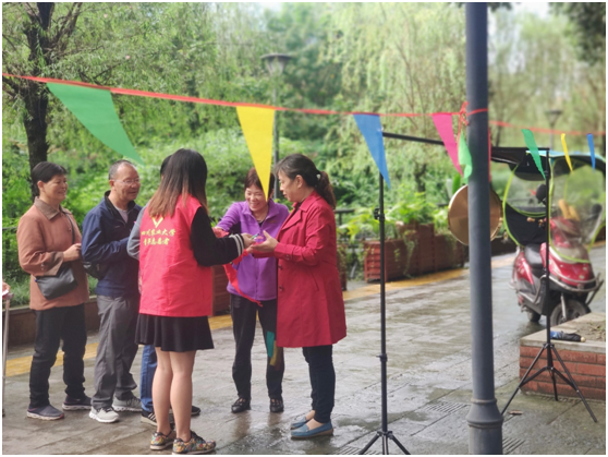 早上8点半,志愿者在学校正门集合并乘车前往华循社会服务中心银杏园小区,在社工的组织下,有序开展活动前的场地布置和礼品摆放。志愿者协助将彩旗拉开、摆上灯笼,灿烂的太阳为小小的场地增添了温暖的气氛。游园活动开始,共分为签到领票和游园游戏两个部分。其中分别有套圈、猜灯谜、掷沙包、蒙眼敲锣四个游戏,每个游戏完成后志愿者负责为老人的游戏票上画勾。四个小游戏虽然简单但是社区老人们却很少有机会能开展这样的游戏,既为他们的生活增添了一份乐趣也是我们志愿服务精神的践行的一种方式。四个游戏结束后,老人根据积分获得了相应的礼品。志愿者也在和工作人员开会后乘车返校。