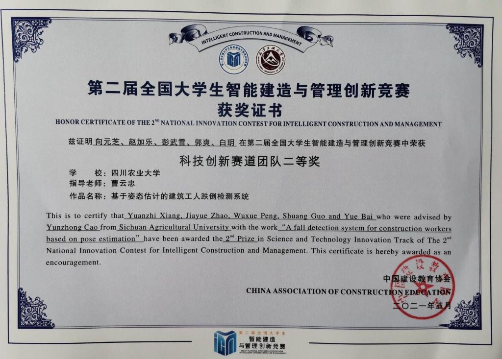 近日,由中国建设教育协会、智慧城市与智能建造产业创新联盟、住房和城乡建设部新型建筑工业化集成建造工程技术研究中心联合主办,北方工业大学和中国建设教育协会校企合作专业委员会承办的“第二届全国大学生智能建造与管理创新竞赛"总决赛及颁奖典礼在北方工业大学落下帷幕。建筑与城乡规划学院CV智造团队的作品《基于姿态估计的建筑工人跌倒检测系统》获A赛道-科技创新赛道团队二等奖。