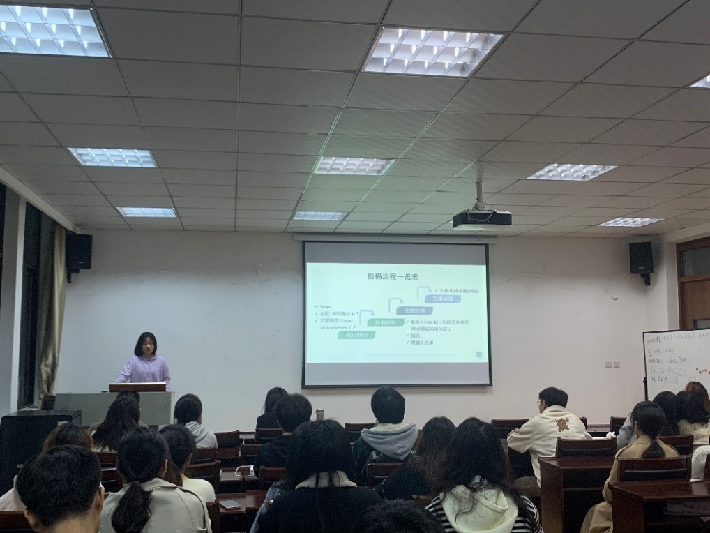 代佳池以自己在SCI/SSCI论文投稿过程中总结的经验教训进行了分享,认为投稿是论文成功发表的重要一步,并向同学们讲述了如何确定投稿期刊,如何准备投稿材料以及如何在线投稿和文章审理等内容。赵宇彤以选题来源、如何有效查找文献包括文献查找要求、文献的选取等内容、文献阅读的技巧,包括阅读文献的全过程,以及判断文献应该需要精读还是泛读、撰写英文论文的方法,原创类型文章结构进行了讲解;黄依澄就一年以来的科研生活经验进行分享,他告诉同学们论文选题大方向来源于导师,小方向应根据个人兴趣进行选择,同时告诫同学们在科研的路上应养成独立思考和及时行动的良好习惯。