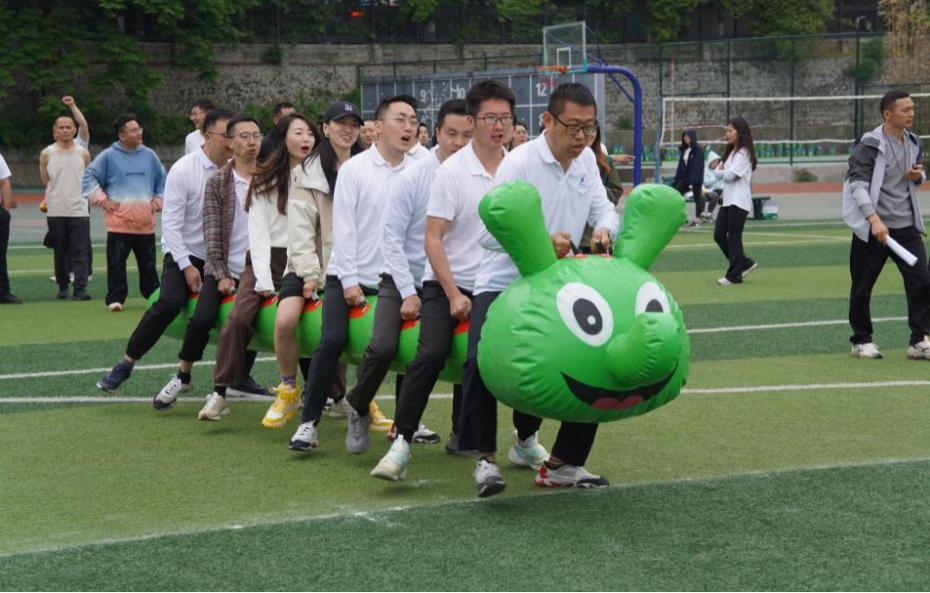 跳远沙坑旁,江丽老师纵身一跃为学院赢得铜牌殊荣。趣味项目区成为欢乐磁场:"抱球接力"中教师们手忙脚乱的接力、"毛毛虫竞速"时六人同频的默契,亦或是跌倒时搀扶的温情瞬间,都让赛场洋溢着此起温暖与真情。