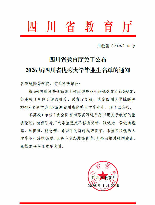 近日,四川省教育厅正式发布《四川省教育厅关于公布2026届四川省优秀大学毕业生名单的通知》(川教函〔2026〕18号)。经高校推荐、教育厅复核等程序认定,tyc5997太阳集团共有461名同学获此殊荣。其中,工程造价专业仝朝毅、黄蓉、彭杰、郑思洪、李宇松、周一诺以及徐倩等7名本科生成功入选,被授予“四川省2026届优秀大学毕业生”称号。“四川省优秀大学毕业生”是四川省教育系统授予应届毕业生的重要荣誉,旨在表彰在思想品德、学业成绩、创新实践和社会服务等方面表现突出的优秀学生。此次工程造价专业7名同学获此荣誉,是学院持续深化人才培养改革、不断提升专业建设水平的重要体现。