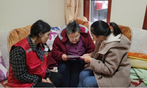 此外,志愿者随社区工作人员进入附近社区,走访当地老人,进行个性化服务。工作人员为老人带去大米、鸡蛋等爱心物资,并与老人开展手势舞、绕口令学习等互动,以多样化、趣味性的形式帮助老人预防认知障碍,给予关怀与陪伴。