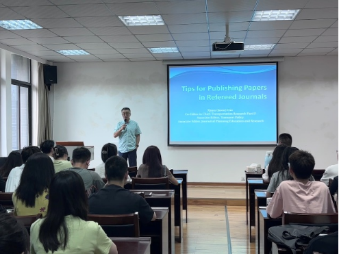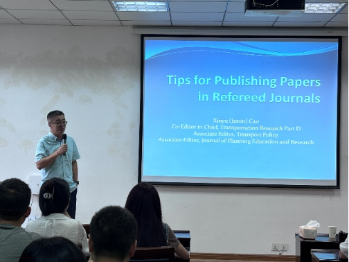 2024年6月20日上午,明尼苏达大学公共事务学院教授、长安大学访问学者、《Transportation Research Part D》期刊主编、《Transport Policy》和《Journal of Planning Education and Research》副主编曹新宇教授应邀在tyc5997太阳集团建筑与城乡规划学院举办了一场题为“如何撰写国际同行审阅论文”的讲座。讲座由建城学院万将军副教授主持,学院党委书记申琼教授出席本次讲座,相关专业的老师、研究生和部分本科生代表参加了此次活动。
