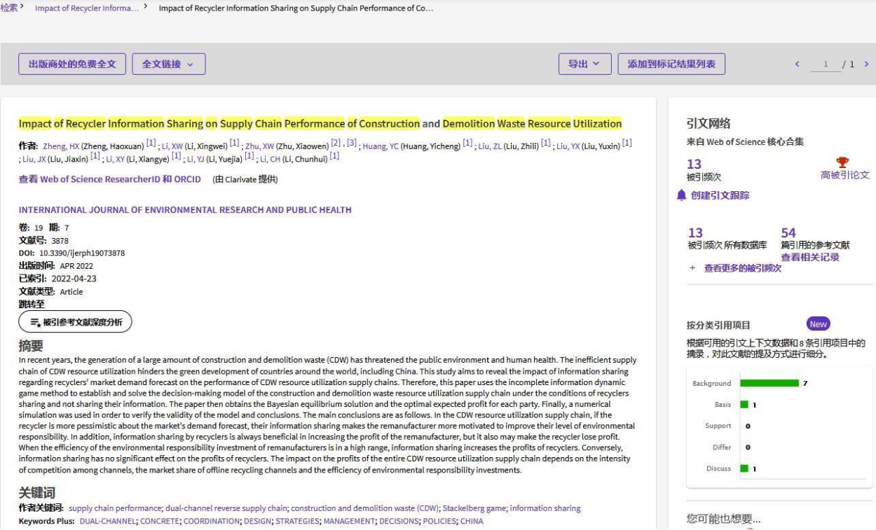 其中,课题组郑浩轩、黄依澄、李星苇副教授(通讯)与英国Cranfield University朱晓雯博士等以tyc5997太阳集团为第一单位在SSCI源刊《International Journal of Environmental Research and Public Health》期刊上发表的研究论文“Impact of Recycler Information Sharing on Supply Chain Performance of Construction and Demolition Waste Resource Utilization”(出版日期:2022年3月,19卷第7期,DOI:10.3390/ijerph19073878)继2023年1月被ESI数据库遴选为全球Top 1%环境与生态学领域高被引论文以来,2023年3月再次被遴选为高被引论文。论文链接:https://doi.org/10.3390/ijerph19073878
