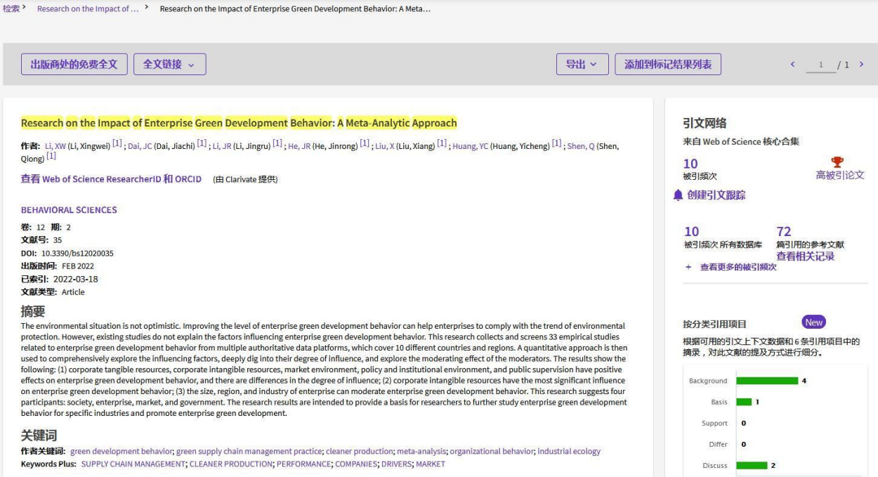tyc5997太阳集团建筑与城乡规划学院申琼教授(通讯)、李星苇副教授、代佳池等以tyc5997太阳集团为第一单位在SSCI源刊《Behavioral Sciences》期刊上发表的研究论文“Research on the Impact of Enterprise Green Development Behavior: A Meta-Analytic Approach”(出版日期:2022年2月,12卷第2期,DOI:10.3390/bs12020035)继2022年11月、2023年1月被ESI数据库遴选为全球Top 1%心理学领域高被引论文以来,2023年3月再次被遴选为高被引论文。论文链接:https://doi.org/10.3390/bs12020035