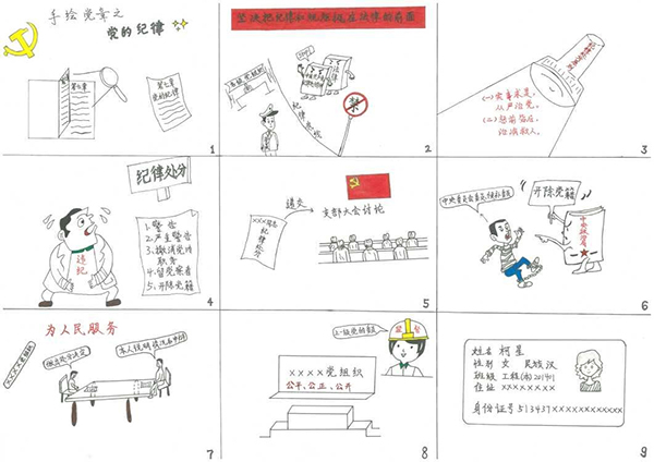 2017年5月30日至6月28号,由我院党委主办,全体学生党支部承办的“绘党章 颂党恩”手绘党章大赛,经过宣传动员、学生参赛、专业评审,微信投票、网络展示等环节,圆满落下帷幕。比赛以党章为内容,通过自己设计、绘制出党章相关章节内容。第一轮比赛采用专业评委评审的形式,从近50件参赛作品中评选出15件进入第二轮,第二轮采用微信投票的方式进行。最终城规2016级2班牟玲利同学绘制的第一章第六条“预备党员必须面向党旗进行入党宣誓”,以微信投票972票摘得头筹,获得一等奖;建筑学2014级2班陈永臻,城乡规划2015级1班吴乃珊获得二等奖;建筑学2015级2班邓梅林等五名同学获得三等奖。