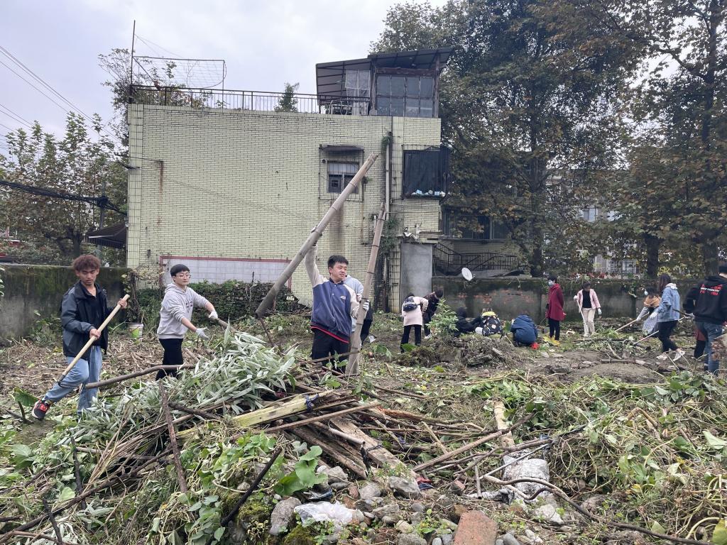 11月4日中午,在学院老师的带领下,支部同志拿着工具来到捡种地,该地块之前因缺乏清晰的管理划分,周边居民随意在地里搭栅栏种蔬果,并将砂石、枯枝、杂物任意堆砌在田中,田间杂乱无章。党员以支部为单位,分工有序地进行拆栏、搬石头、除草、刨坑……每个人的汗水挂满了脸颊、浸透了衣裳。但大家并没有因此抱怨或是放弃,而是相互打气、勉励坚持。