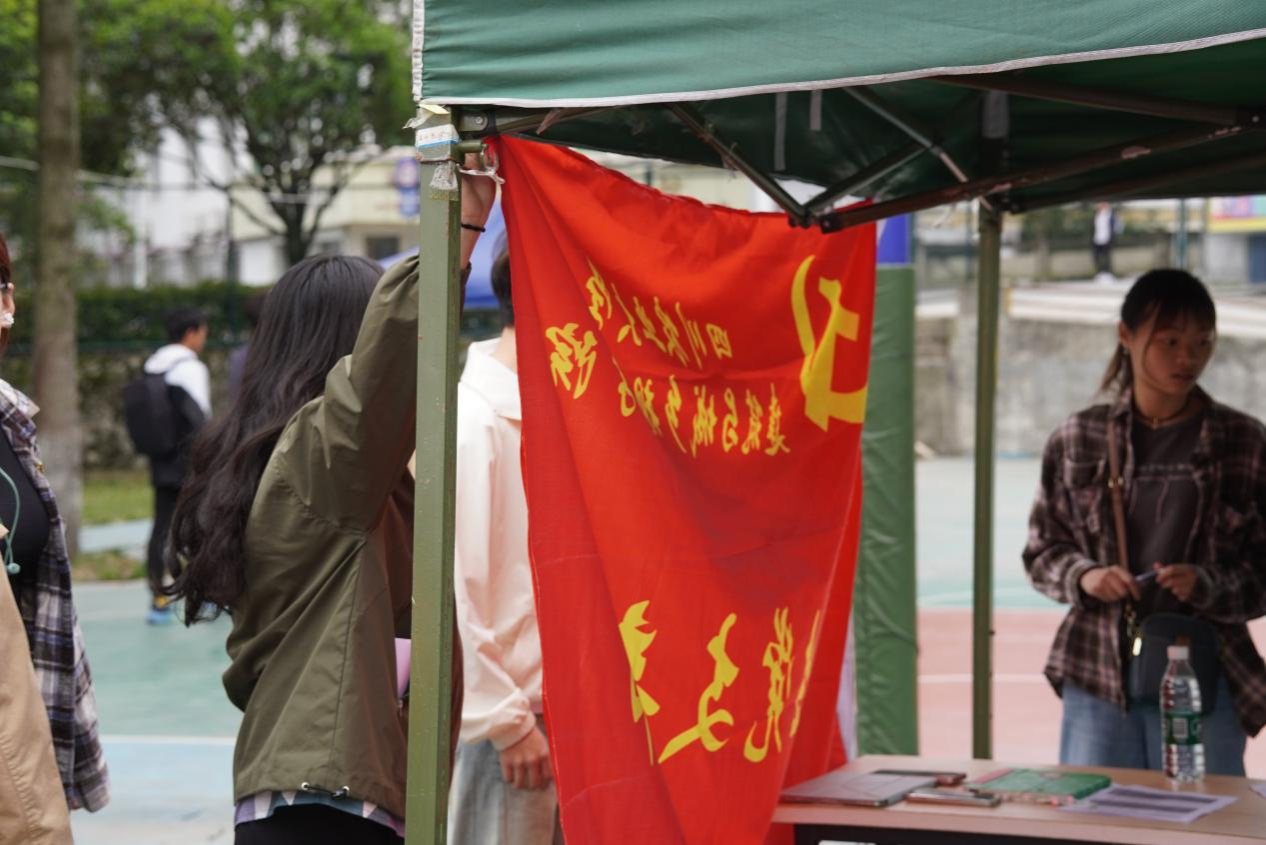图为学生党支部同学布置服务点