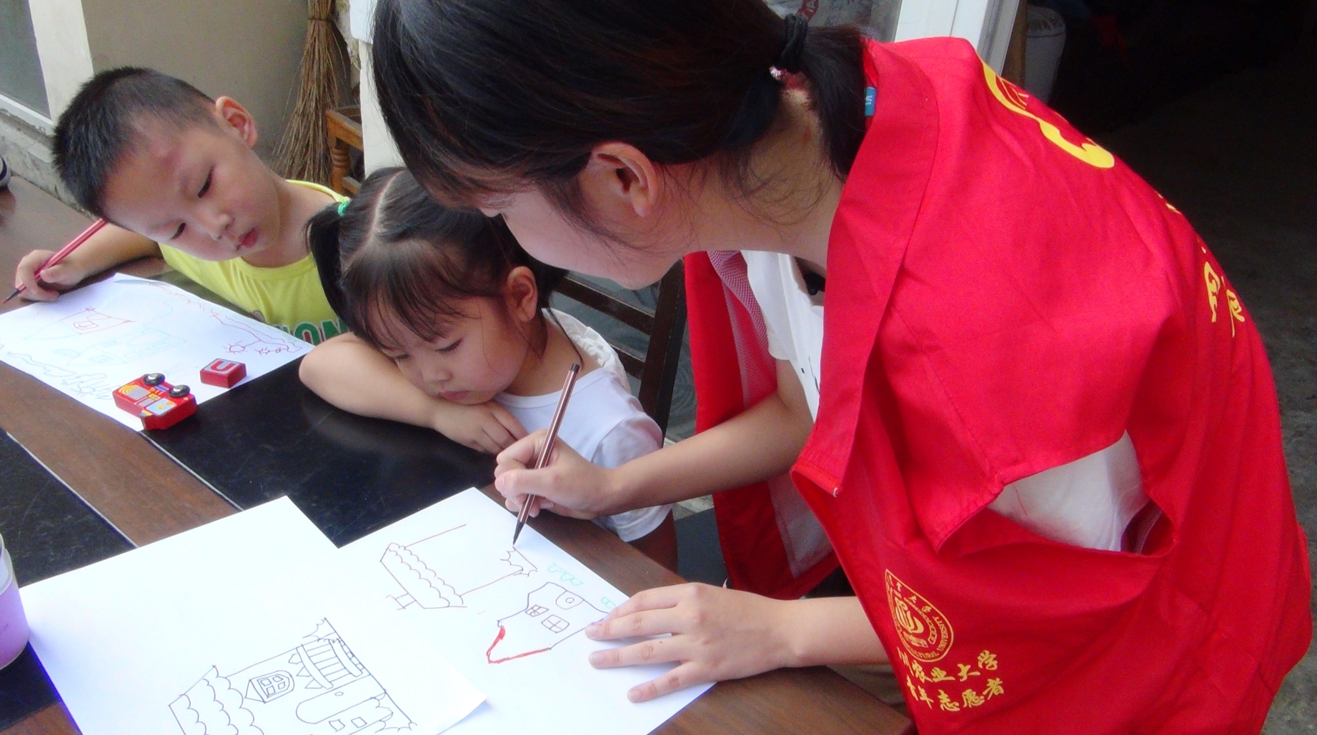 小小的A4纸上,被孩子们填满了方正四边,两窗尽开的屋、娇艳欲滴,姹紫嫣红却又如树般大的花、高低起伏、层层叠叠却又不知通向的路…………孩子们一边耐心地作画,一边不断地向大哥哥大姐姐们征求意见。掩藏不住的骄傲的神色,又暴露了他们炫耀式的狡猾。参与绘画的还有个约五岁的小孩,因为年龄尚幼,索性就由妈妈握着手一起画,母子两个人一边作画,一边低声交流,通力合作,完成了一部满是爱的佳作。