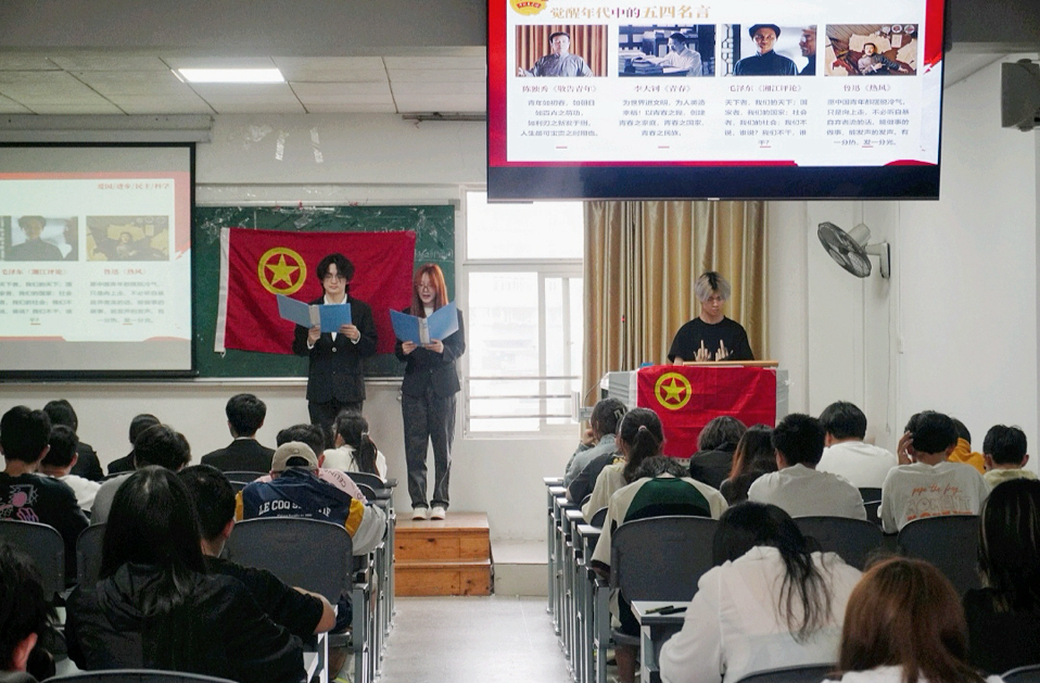 伴随着嘹亮慷慨的团歌,活动正式拉开帷幕。主持人从电视剧《觉醒年代》切入,带领同学们重温陈独秀、李大钊等革命前辈的名言,引导广大青年继承和发扬五四精神。