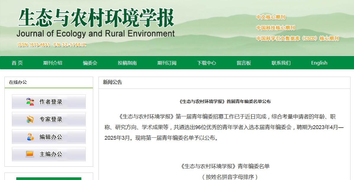 《生态与农村环境学报》系生态环境部主管、生态环境部南京环境科学研究所主办的全国性学术期刊,本刊宗旨是及时报道生态与农村环境保护领域创新性成果等,开设研究报告、研究简报、研究方法、专论与综述、学术讨论与建议等栏目,涉及以下主要内容:(1)区域环境与发展,包括生态环境变化与全球环境影响、区域生态环境风险评价、环境规划与管理、区域生态经济与生态安全等;(2)自然保护与生态,包括自然资源保护与利用、生物多样性与外来物种入侵、转基因生物环境安全与监控、生态保护、生态工程与生态修复、有机农业与农业生态、气候变化与生态响应等;(3)污染控制与修复,包括污染控制原理与技术、土壤污染与修复、水环境污染与修复、大气污染防控、农业废物综合利用与资源化、农用化学品风险评价与监控、化学品环境与健康等。曾荣获全国优秀环境科技期刊、江苏省优秀期刊、第二届江苏“十强科技期刊”、第三届江苏省新闻出版政府奖期刊奖提名奖、第七届华东地区优秀期刊、首届江苏省科技期刊优秀论文奖。